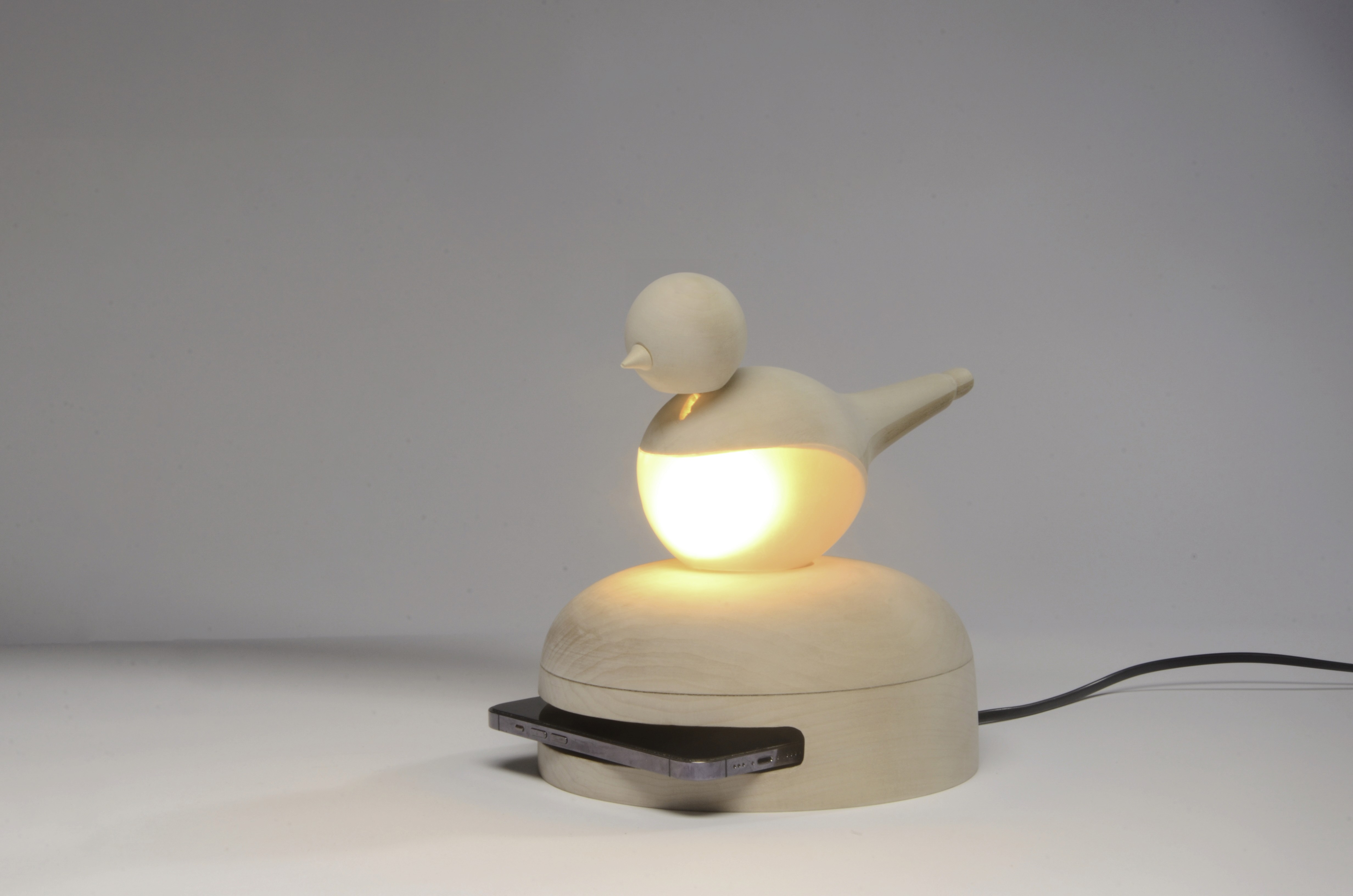 Night lamp designed to encourage sleep by requiring users to put their phone away, gradually dimming as the bird's head tilts down to signal rest.