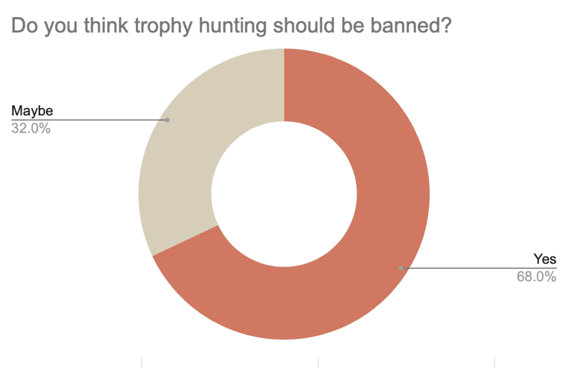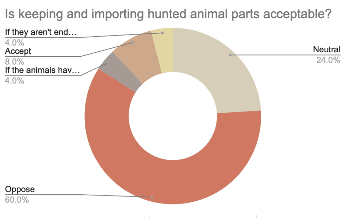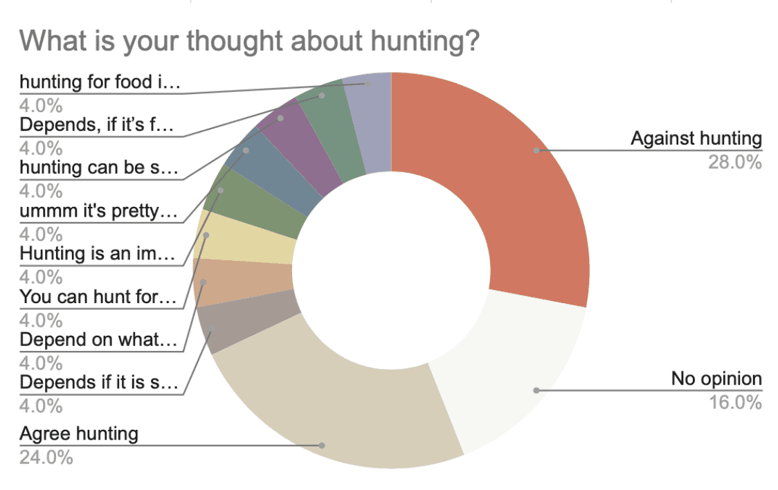 While many respondents were neutral about hunting for food, ritual, or survival, the majority strongly opposed trophy hunting for sport. Some of their responses included: