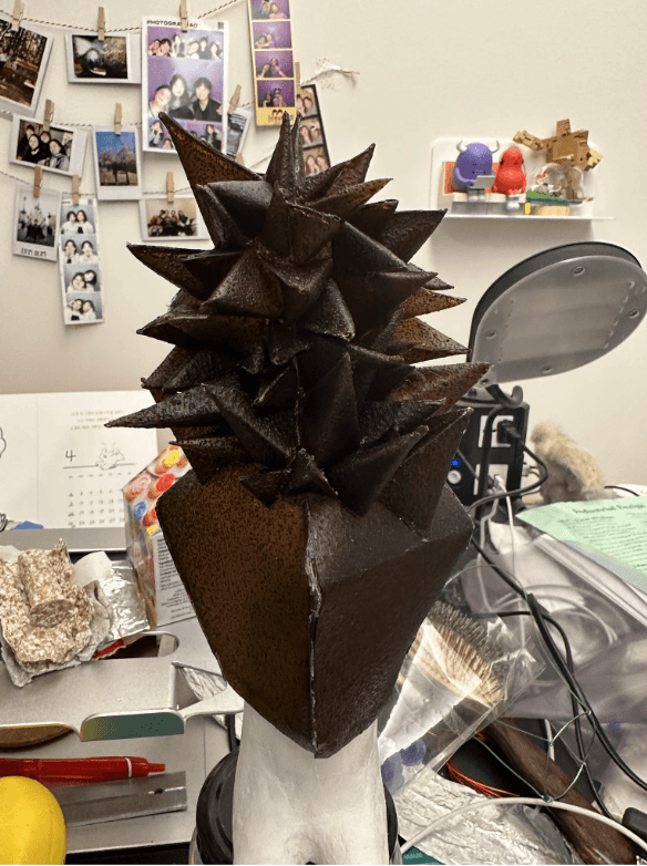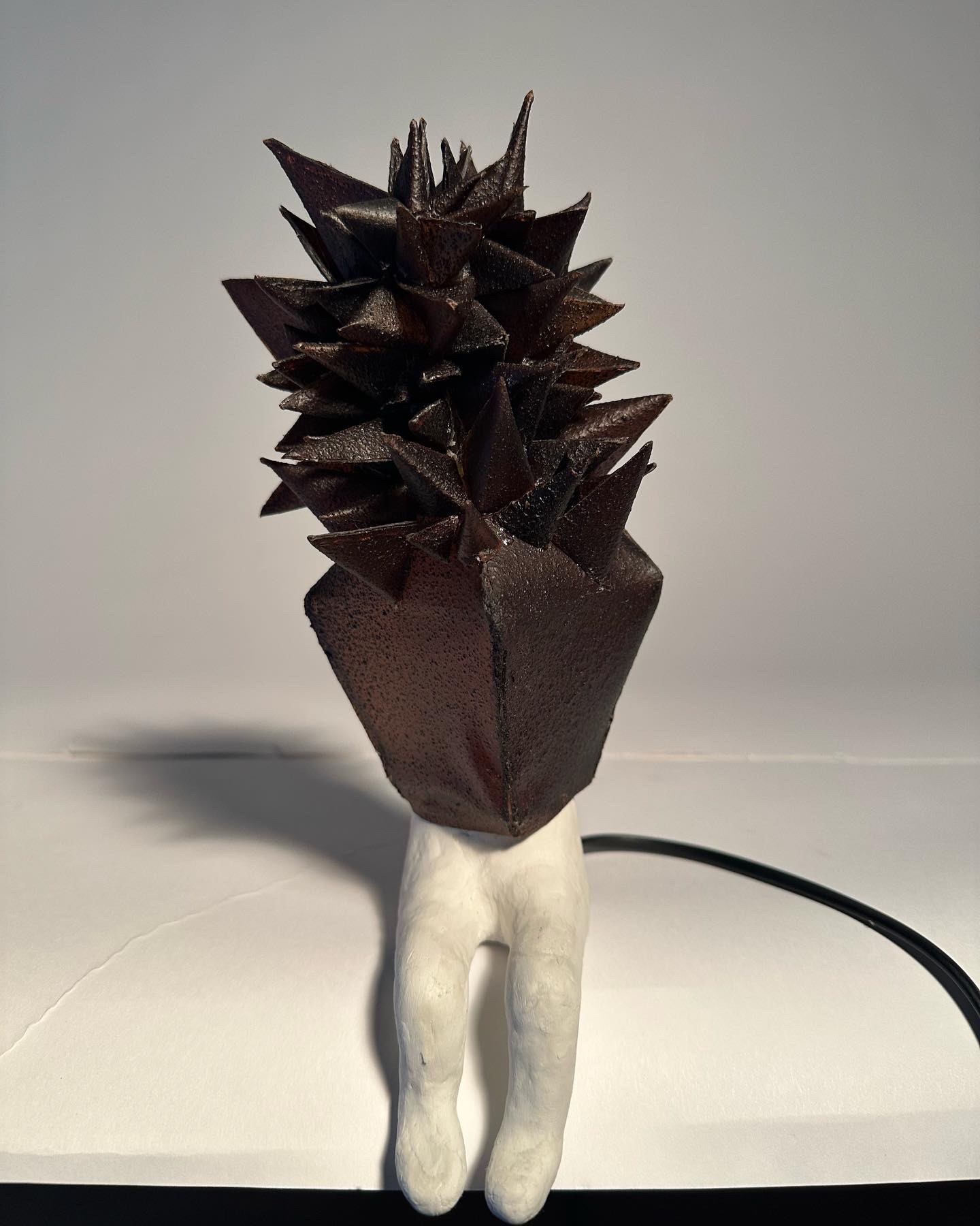 Small, pyramid-like protrusions create a jagged surface, symbolizing a protective exterior that conceals the inner self. When illuminated, the coffee-ground bioplastic emits a warm brown glow, reflecting the contrast between external defensiveness and inner warmth.