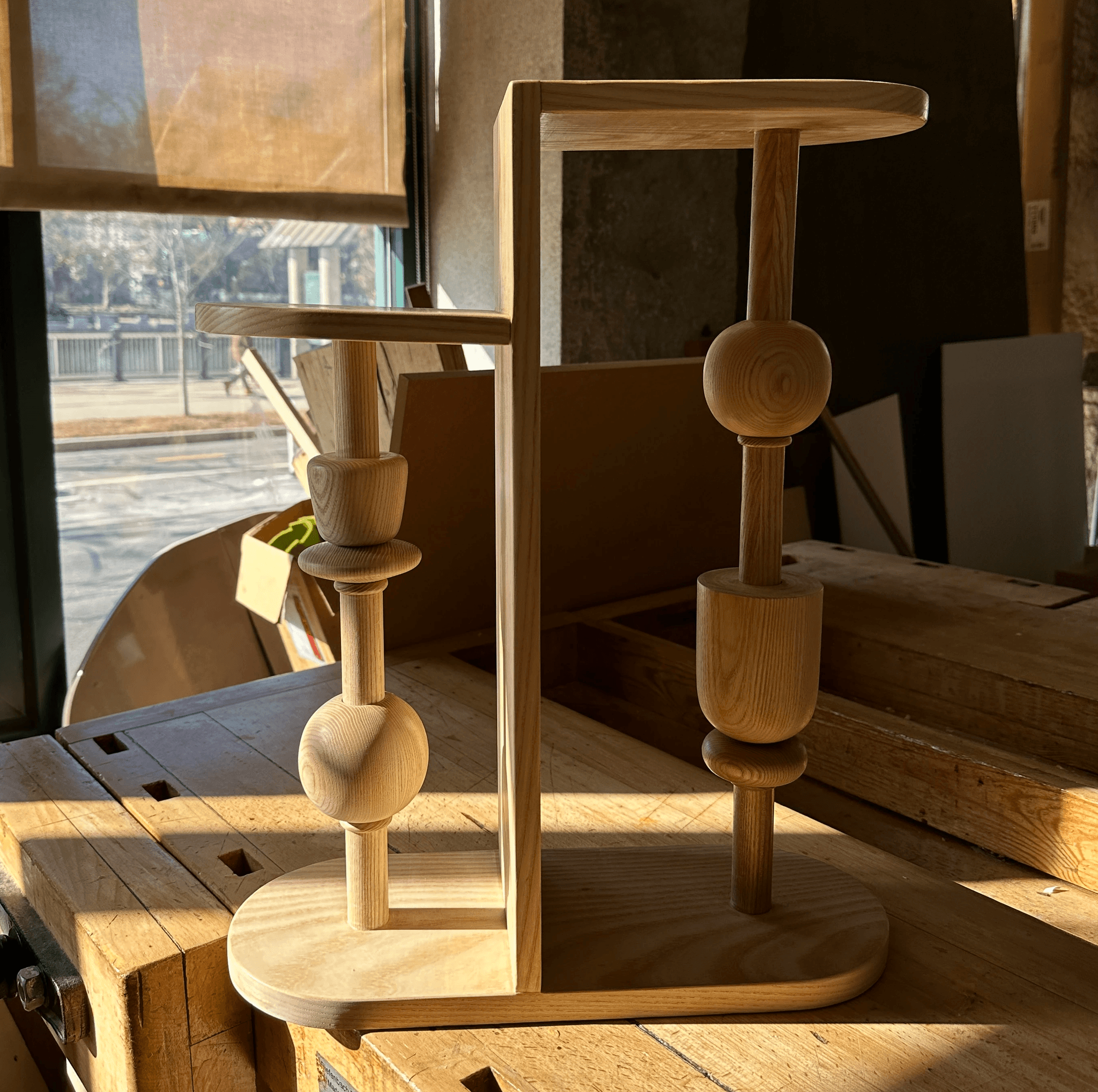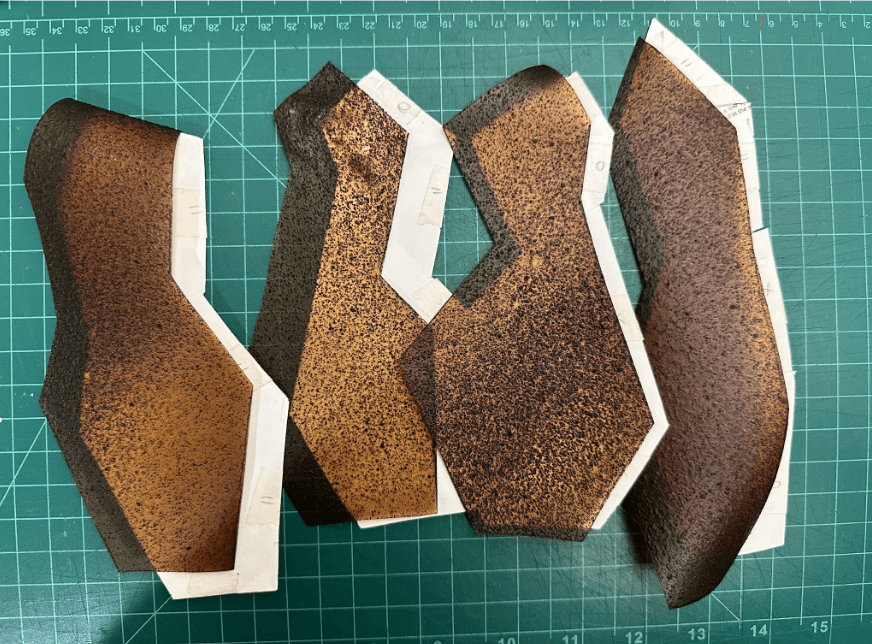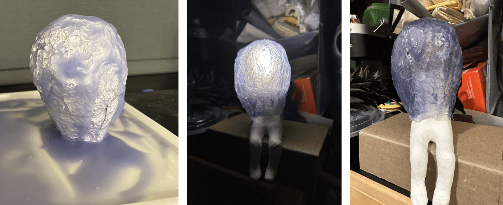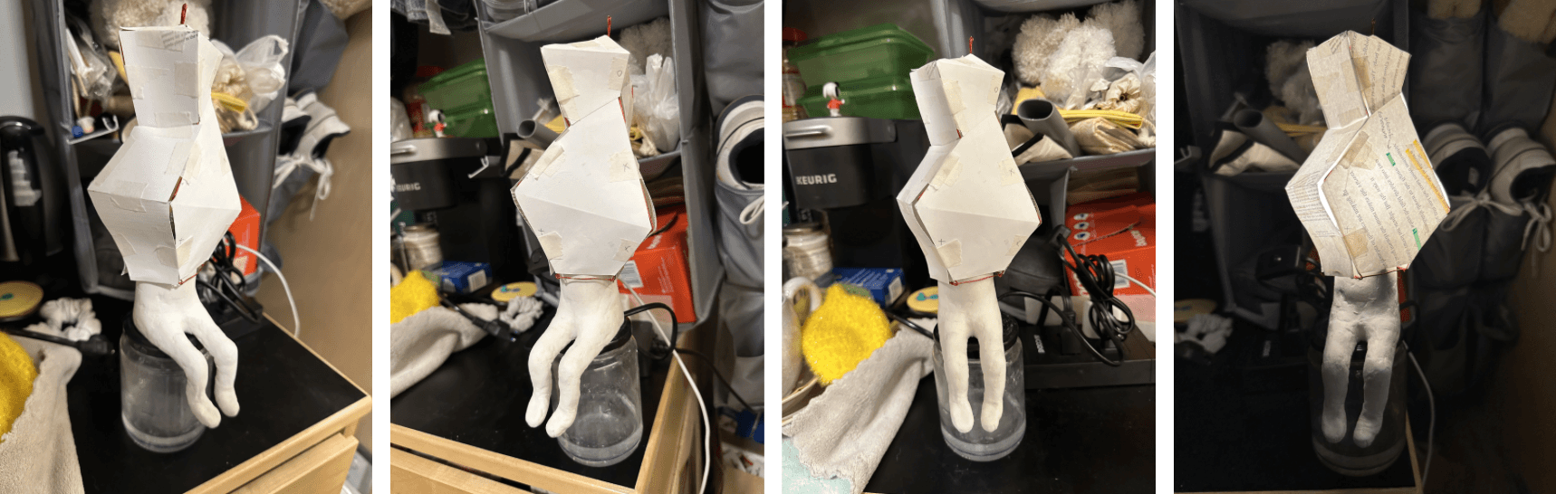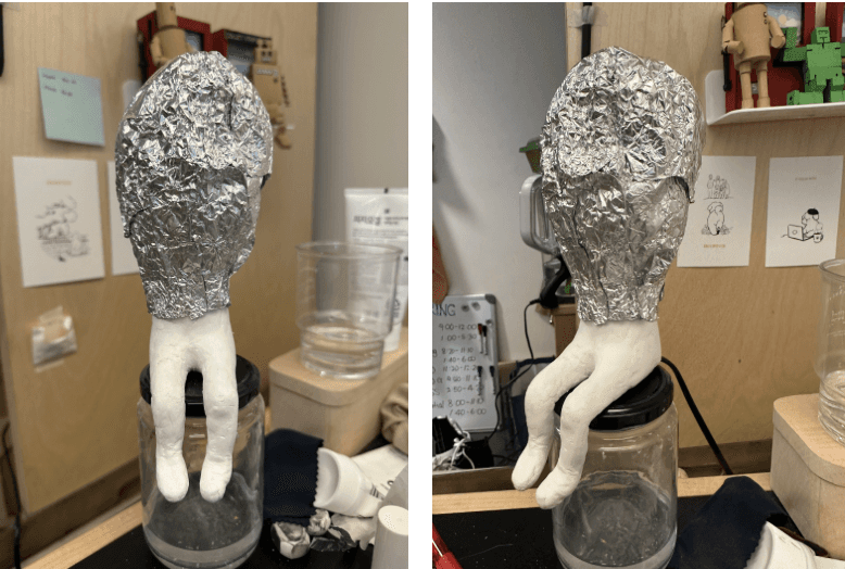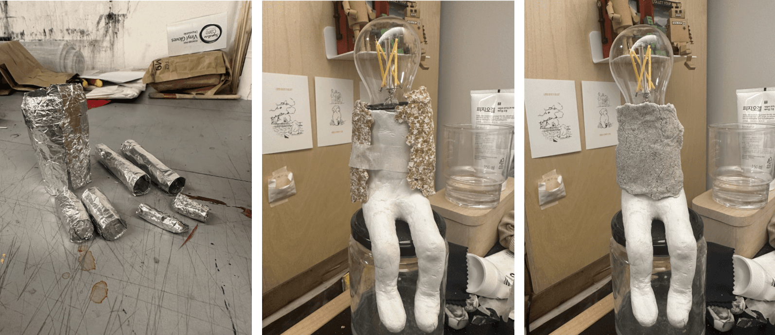 After prototyping with paper to refine the size and form, I created a tin foil template to experiment with two biomaterial compositions. The first, an eggshell-starch mixture, proved too rigid for the intended shape. The second, a cornstarch-based paste, encountered adhesion issues when applied to an air-dry clay structure. Due to time constraints, I proceeded with an air-dry clay base, setting aside further biomaterial integration for future iterations.