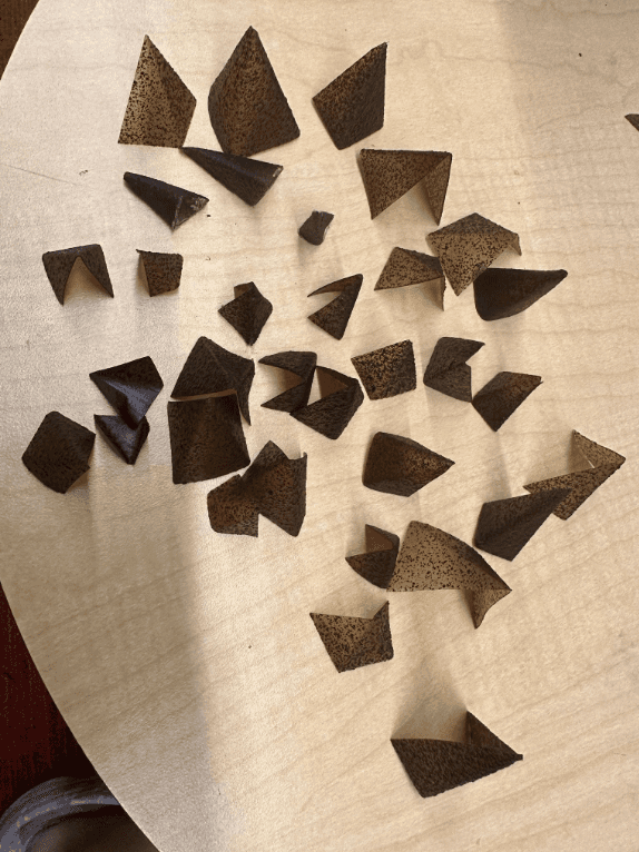 To represent insecurity, I designed an irregular, textured structure that embodies both self-protection and vulnerability. The cover consists of four asymmetrical panels forming an angular shape, constructed from coffee-ground bioplastic made with starch, glycerin, gelatin, and water.