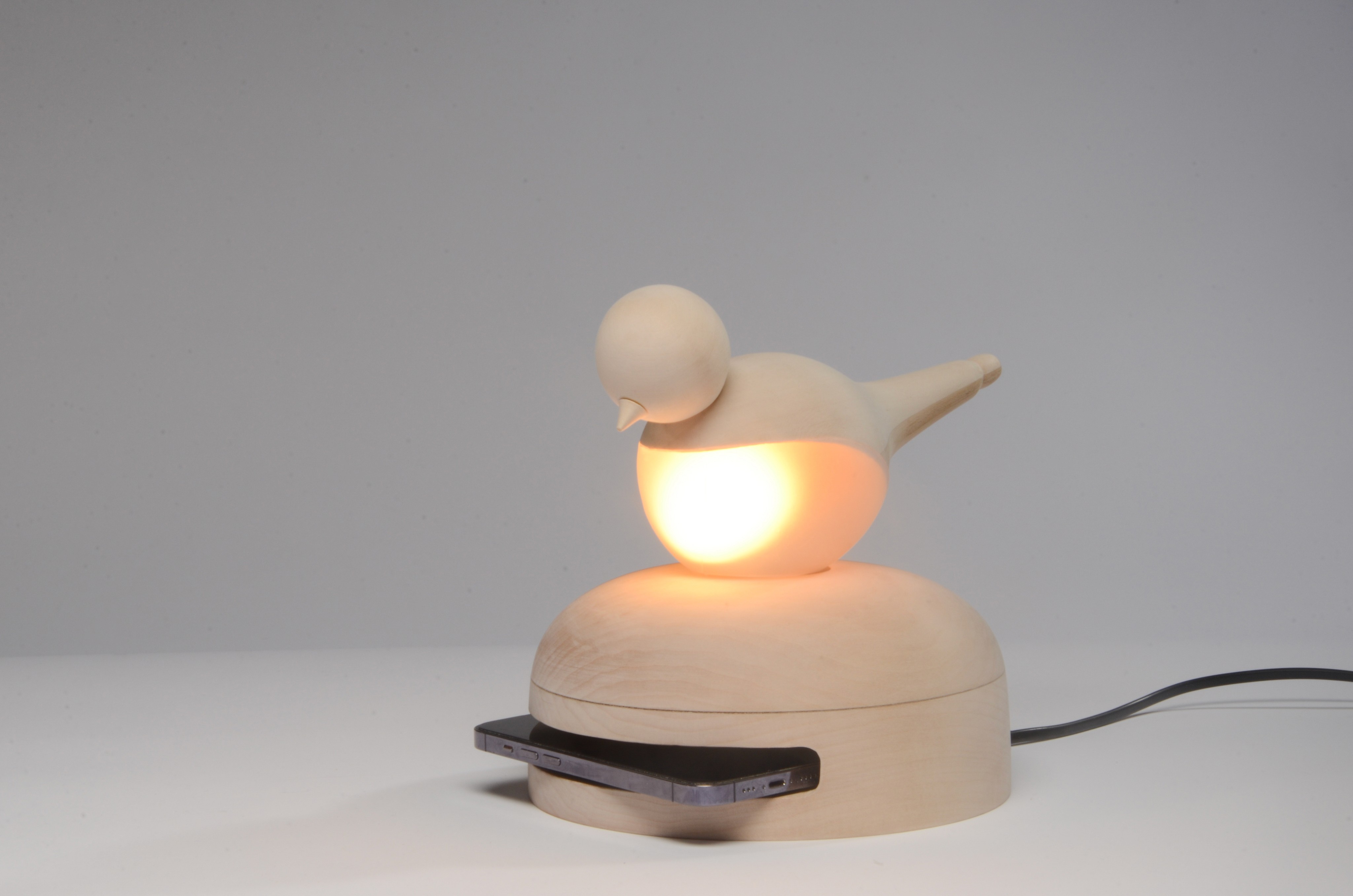 Night lamp designed to encourage sleep by requiring users to put their phone away, gradually dimming as the bird’s head tilts down to signal rest.